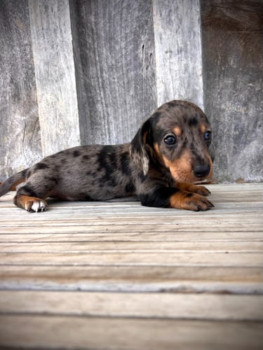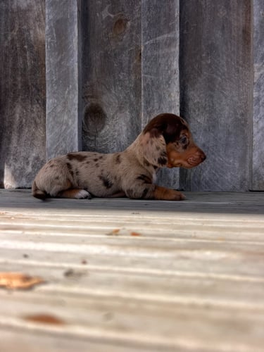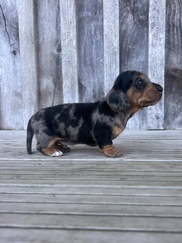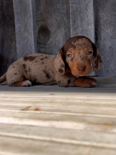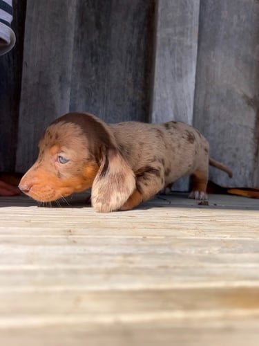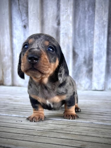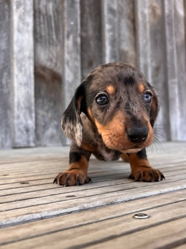 Beautiful smooth silver dapple queen met a handsome long-haired chocolate and tan stud to create unique, boutique mini dachshunds....and they are such a delight! Miniature dachshund puppies born 2nd November 2025 and they will be ready JUST IN TIME for Christmas! Delivery, or pick up, available from 22 December 2025.